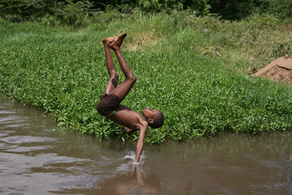 Mit unserem ortskundigen Elia machten wir uns auf, die Reisfelder in Hotelnähe zu suchen und schon nach wenigen Schritten wurden wir aus unserer durch die Hitze verursachten Lethargie gerissen, lautes Kindergeschrei - verhieß dies denn was Schreckliches? Bald war der Ort des Krachs und somit unser Ziel ausgemacht. Nichts wie hin und helfen. Bald standen wir da vor einer wilden Horde kleiner schwarzer Bengel und nichts war mit schrecklich, denn diese kleinen afrikanischen Jungs hatten sich die Springlands, im wahrsten Sinne des Wortes zur Quelle ihrer Freude gemacht, sie tobten in dieser durch Wasser vom Kilimanjaro gespeisten unterirdischen Quelle, in dem von hier aus beginnenden kleinen Bächlein. Dass sie es genossen, hörten wir unweigerlich an ihrem Gebrüll. Wir genossen den Anblick der fröhlichen Kinder, die immer während sich ins Wasser stürtzten und je mehr wir beim Zuschauen Spaß daran hatten, umso größer wurde der ihre.